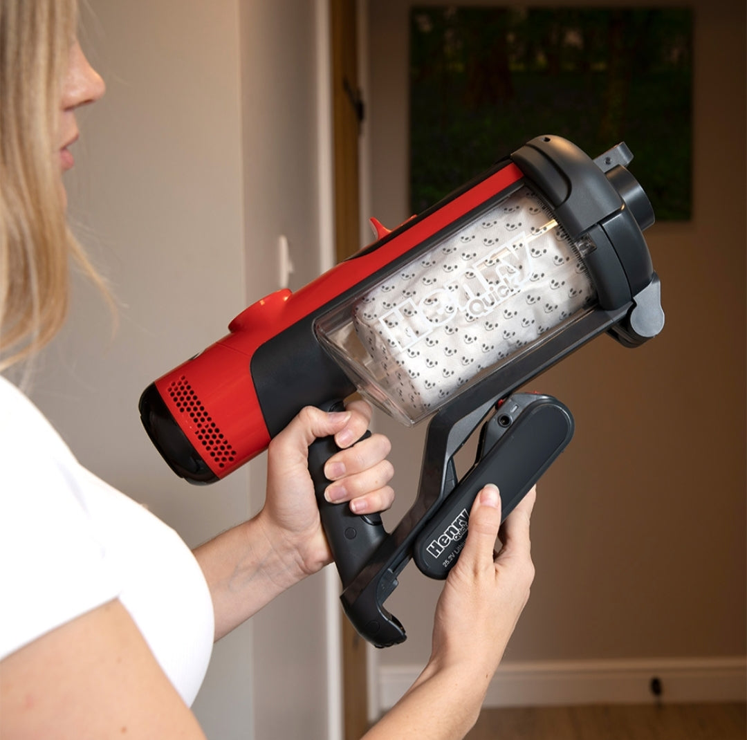 Toisin kun monet varsi-imurit, Quick ei ole pussiton vaan iso 1L säiliö on varustettu suodatinpussilla, joten tyhjennys on täysin pölytöntä ja helppoa vain yhdellä painalluksella.
