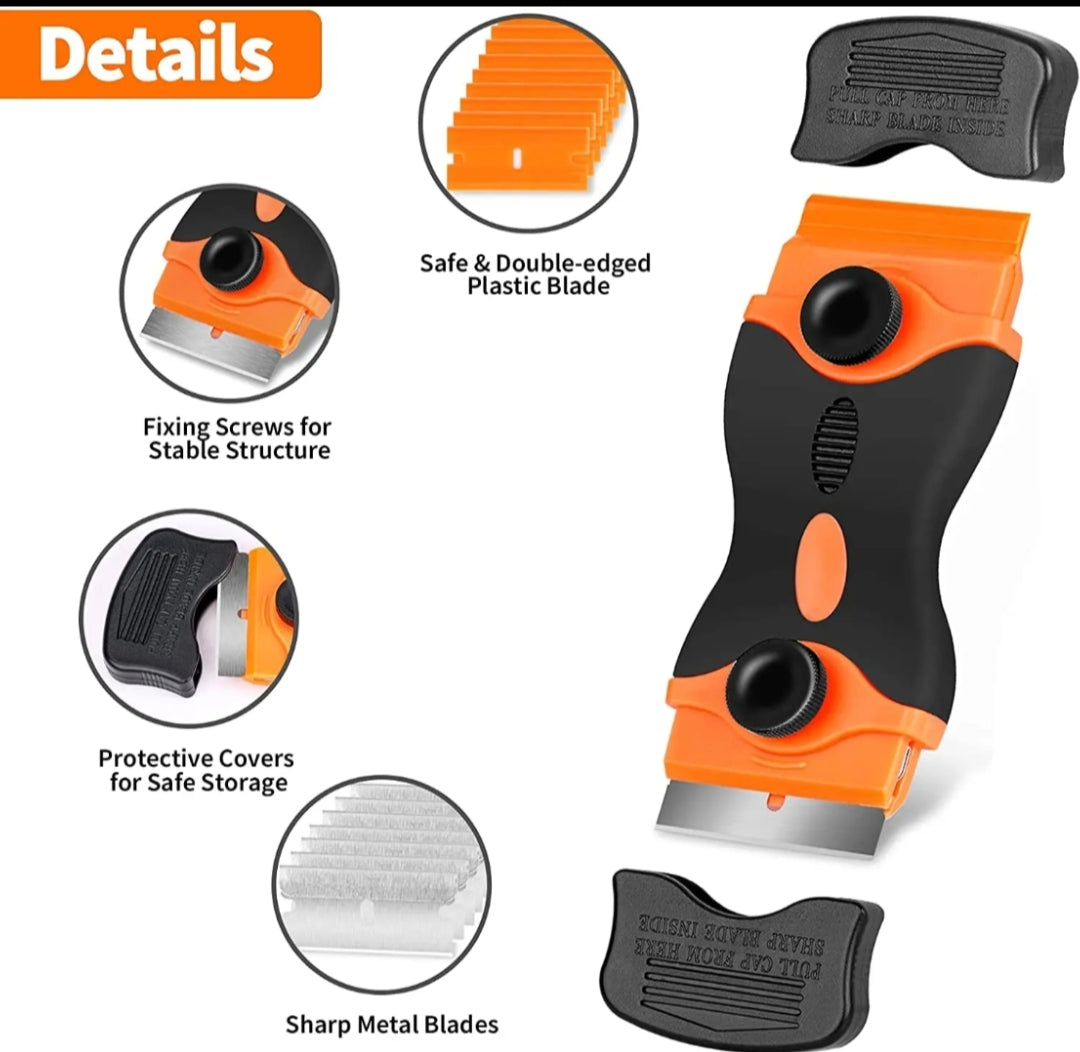 Tämä monikäyttöinen mini-raappa on kätevä ja turvallinen työkalu tarrojen, teippien, liiman, ikkunakalvojen, auton maalipinnan epäpuhtauksien sekä muiden pintaa vaurioittamattomien jäämien poistoon. Ergonominen muotoilu ja luistamaton kahva tekevät käytöstä miellyttävää, ja mukana tulevat vaihtoterät varmistavat pitkän käyttöiän.