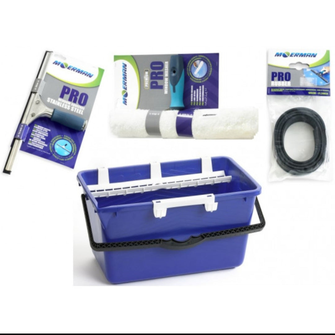 Moermanin Sanko 18 L, joka sisältää pesuvälineiden pidikkeen. Moerman ikkunapesimen runko, sekä 35 cm leveän Ergonomisesti muotoiltu kahva ja kumiosat takaavat pitävän otteen kädelle. Moerman nukkakangas, 35 cm leveä Mikrokuituinen, erittäin tehokas ja imukykyinen nukkakangas.Toisessa päässä pieni hankauslevy tahrojen poistoon. Moerman Ikkunakuivaimen kahva, antaa tukevan otteen kädelle ja kiskon vaihtoa nopeuttavajousitettu kahva on ruostumatonta terästä ja kuivaimen kumi on pehmeä, 35 cm leveä mukana tulee myös vaihtokumi 105cm.